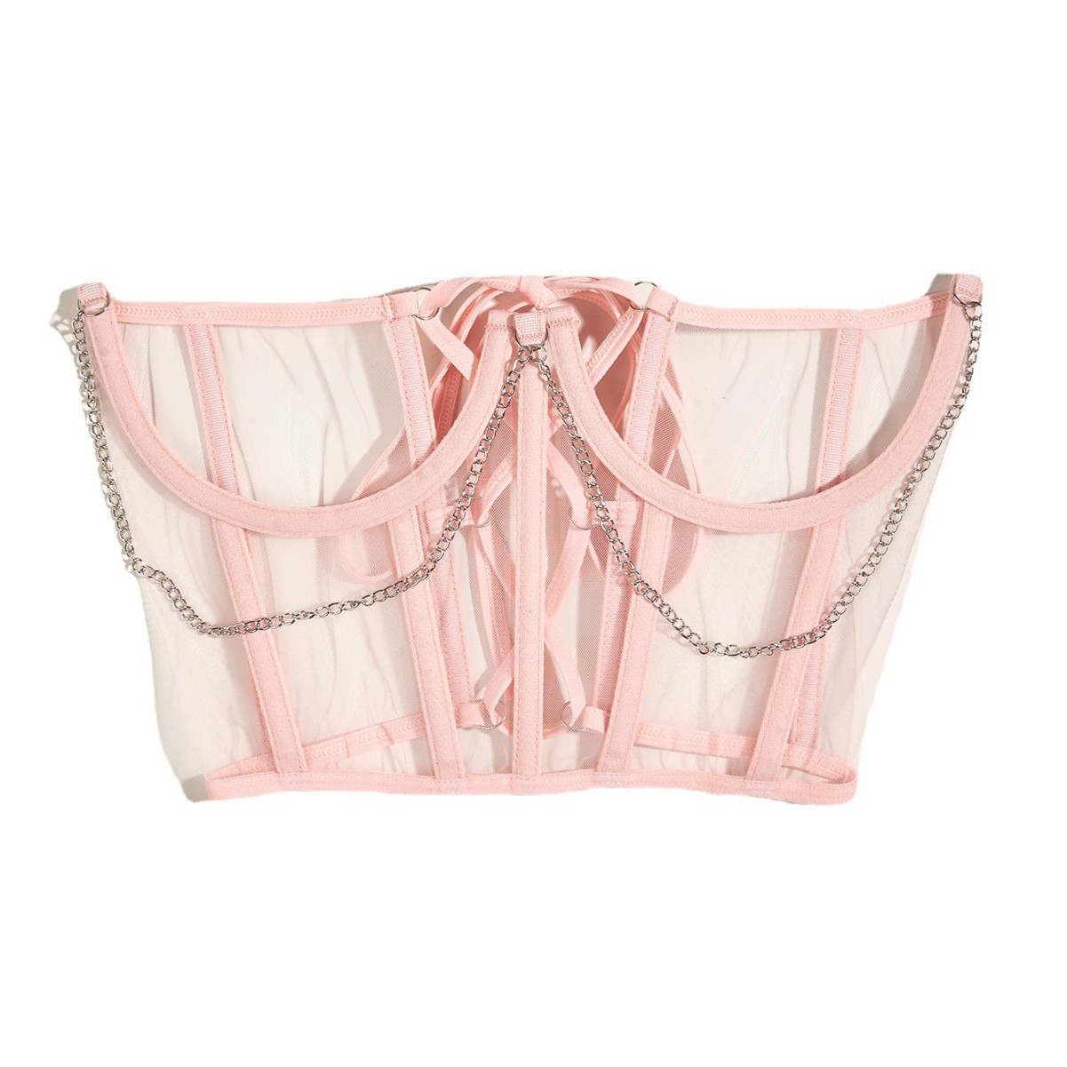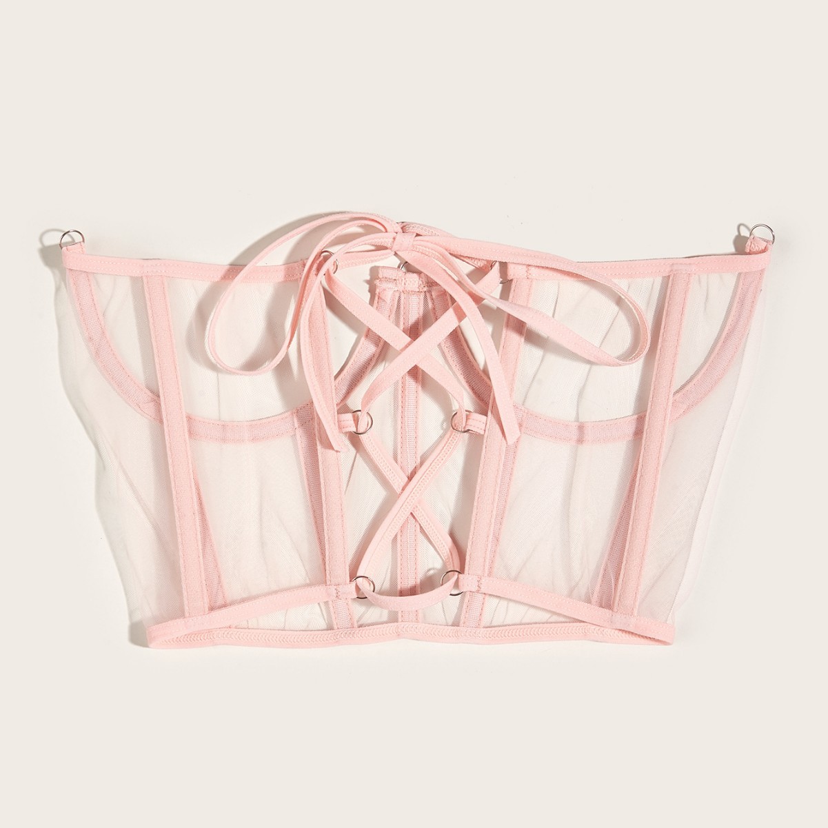 欧美绑带腰封,透明网纱材质,钢圈鱼骨修身设计,粉色系,适合外搭穿搭。