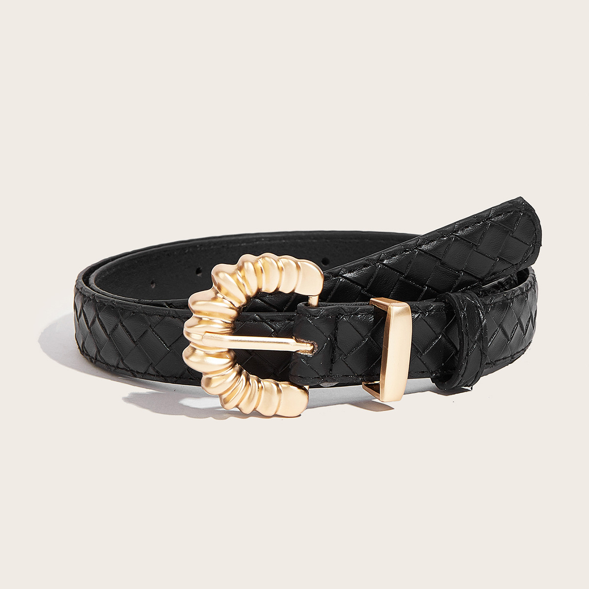 这款优雅的腰带采用独特的珍珠金齿轮形带扣和编织纹理的PU皮革制成。斜切边缘更添精致感,使其成为休闲和半正式场合的理想之选。