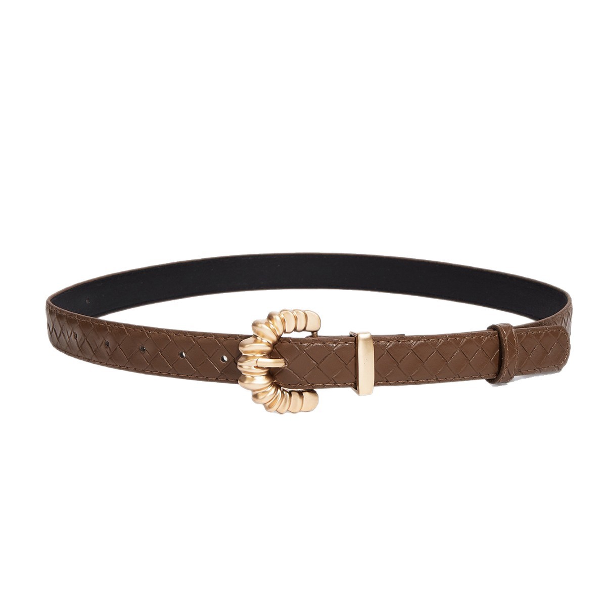 这款优雅的PU皮革腰带,搭配珍珠金齿轮扣和编织纹理,边缘采用斜面设计,更显精致。现有黑色和棕色可选。是搭配牛仔裤和休闲装的理想之选。