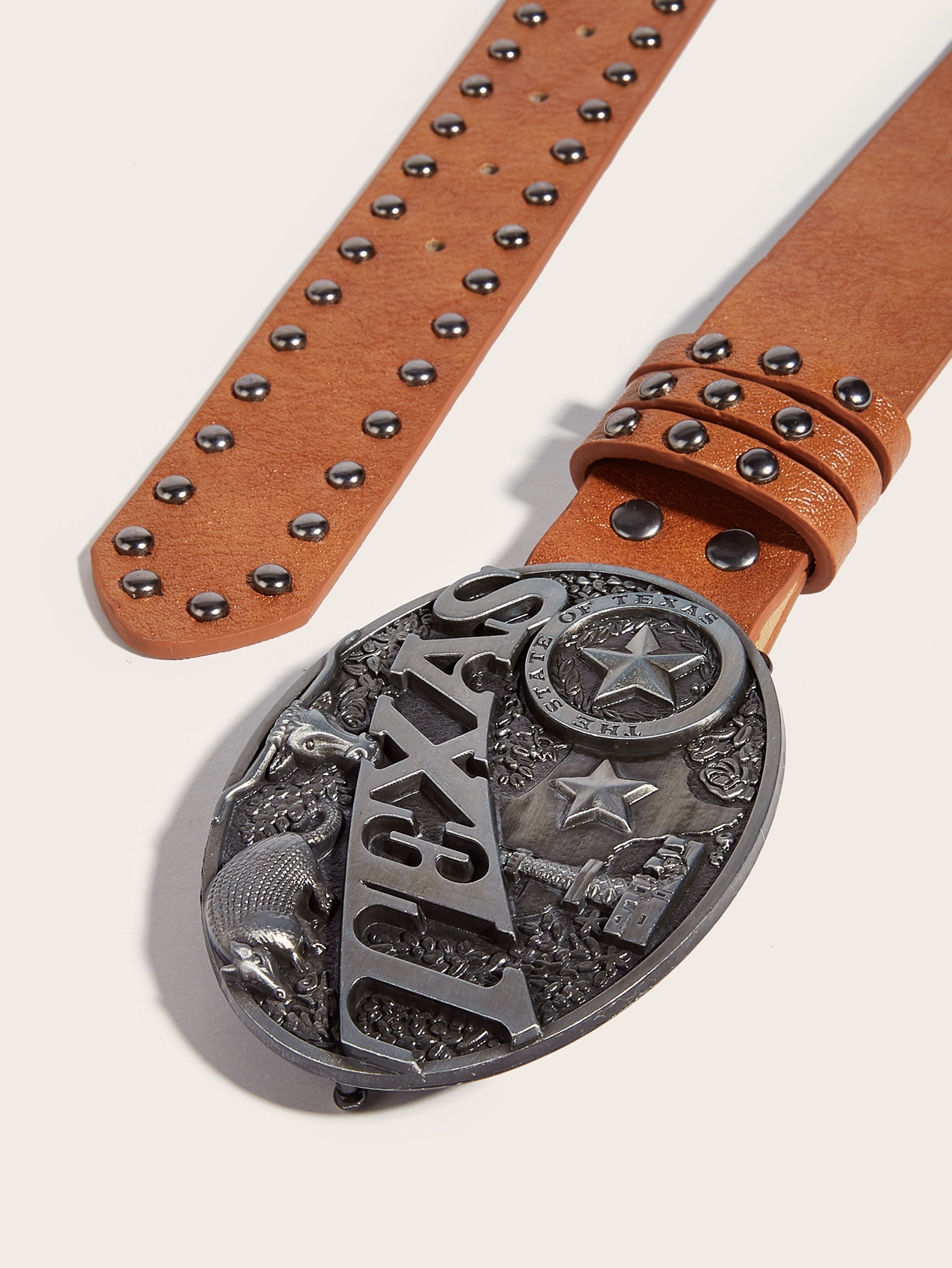 朋克铆钉腰带,按扣闭合。PU皮革材质,手工串珠细节,长度105厘米。黑色和驼色可选。
