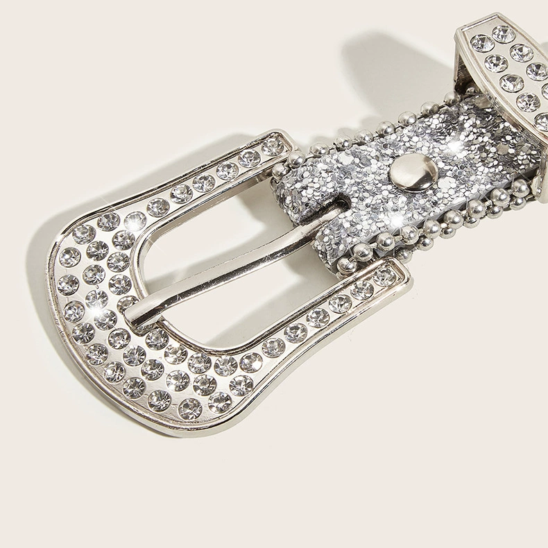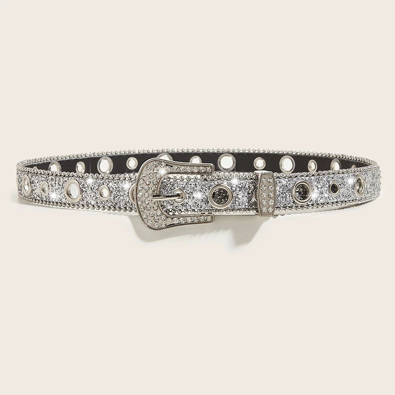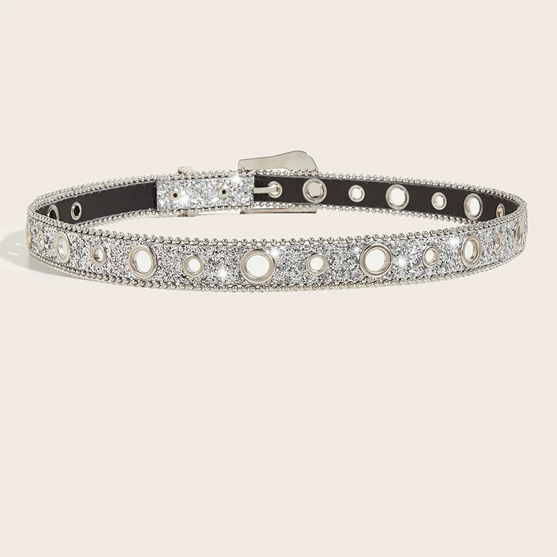 闪亮水钻腰带,饰有镂空细节。时尚配饰,可搭配牛仔裤和连衣裙。引领ins风潮流。