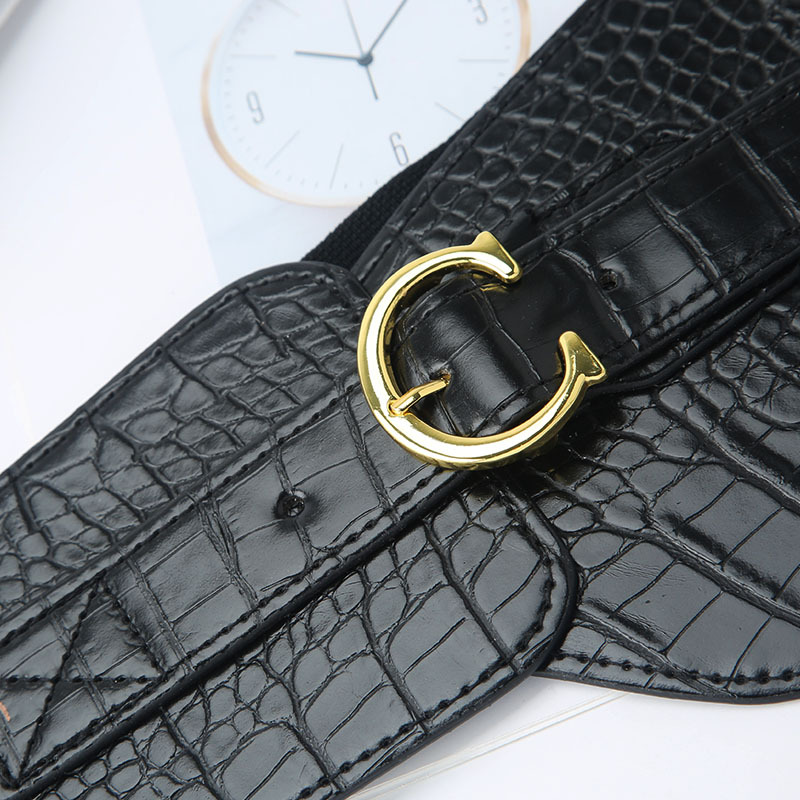 This stylish elastic waist belt features a unique wide design perfect for pairing with coats, dresses, and suits. The belt has elastic stretch for comfortable fit.