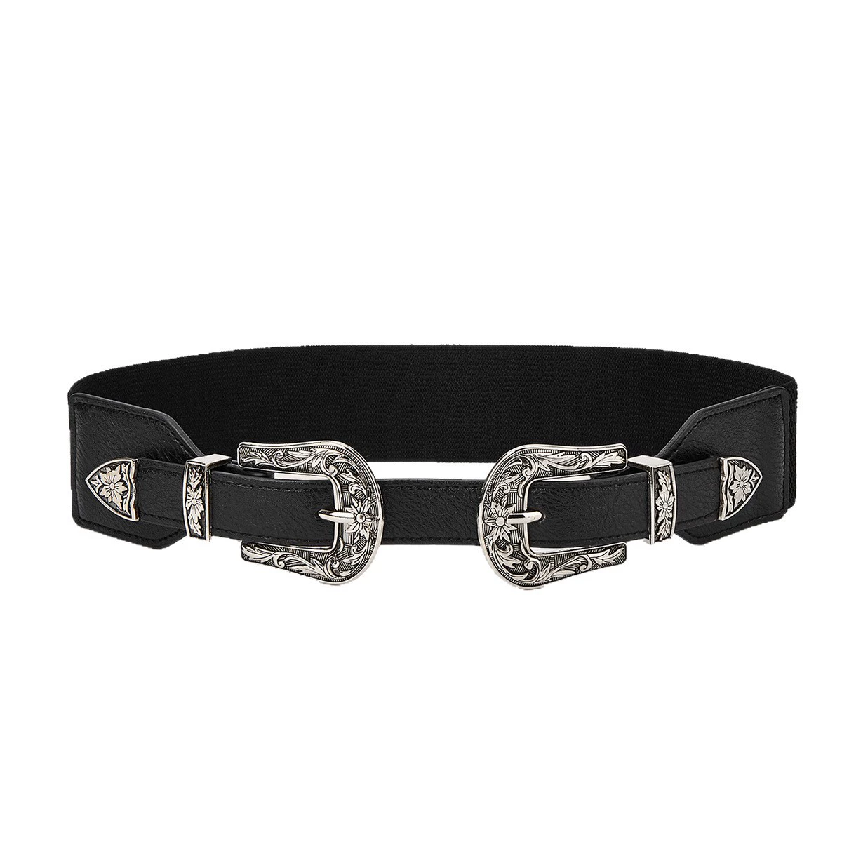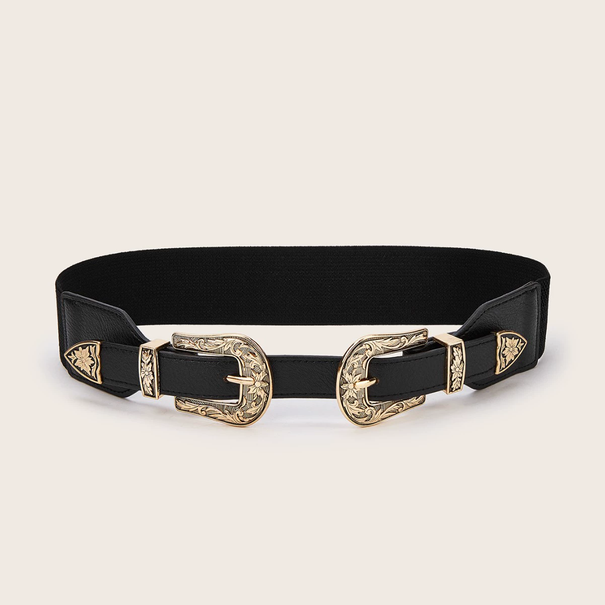 6厘米宽的弹力腰带,配复古雕花搭扣。非常适合搭配连衣裙和外套。有金色和银色可选。