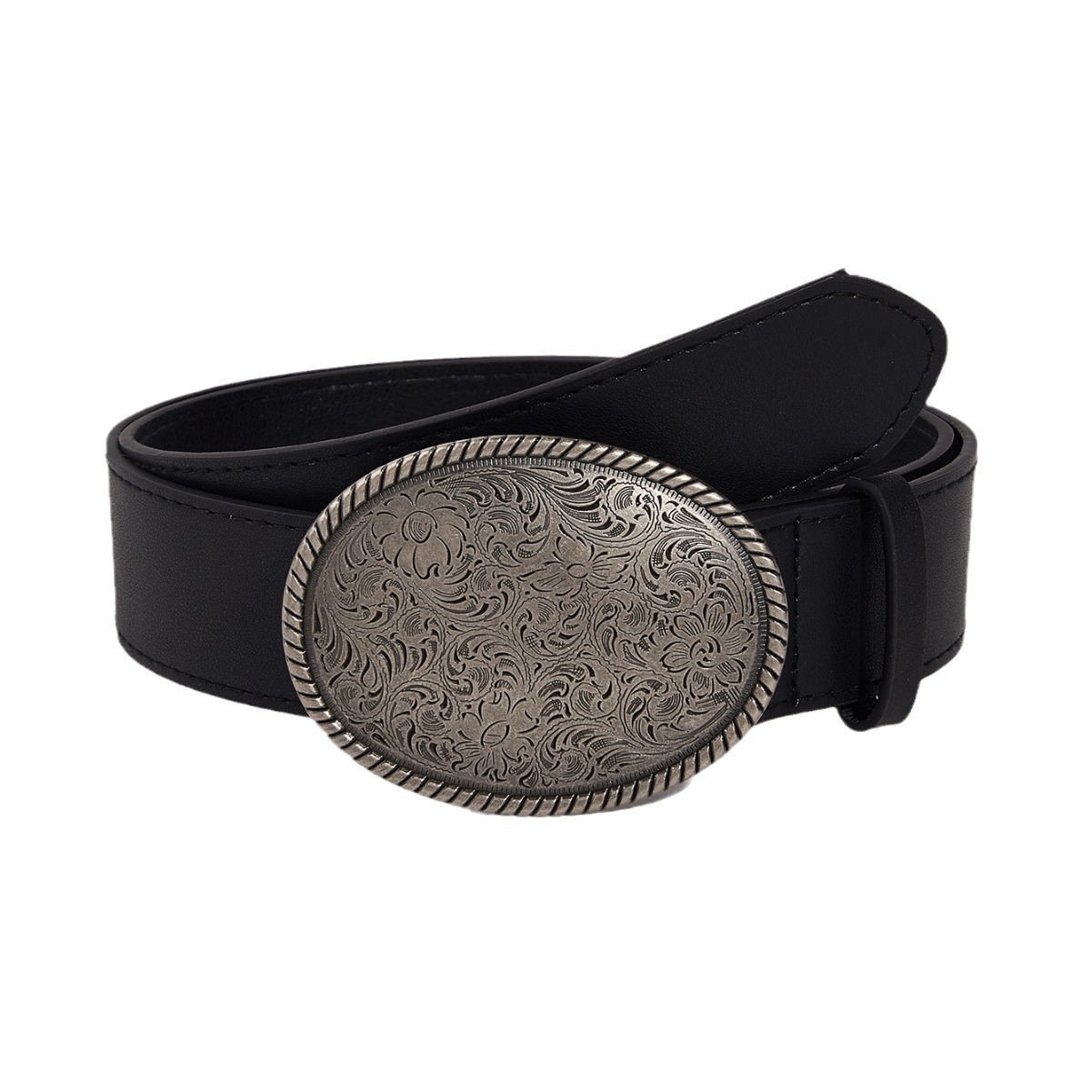 Premium vintage western style PU leather belts for men, made of high-quality faux leather with engraved oval alloy buckle. 3.8cm width, durable & comfortable. Factory wholesale, custom logo, custom size & low MOQ available for bulk orders, retail resale and brand OEM service.