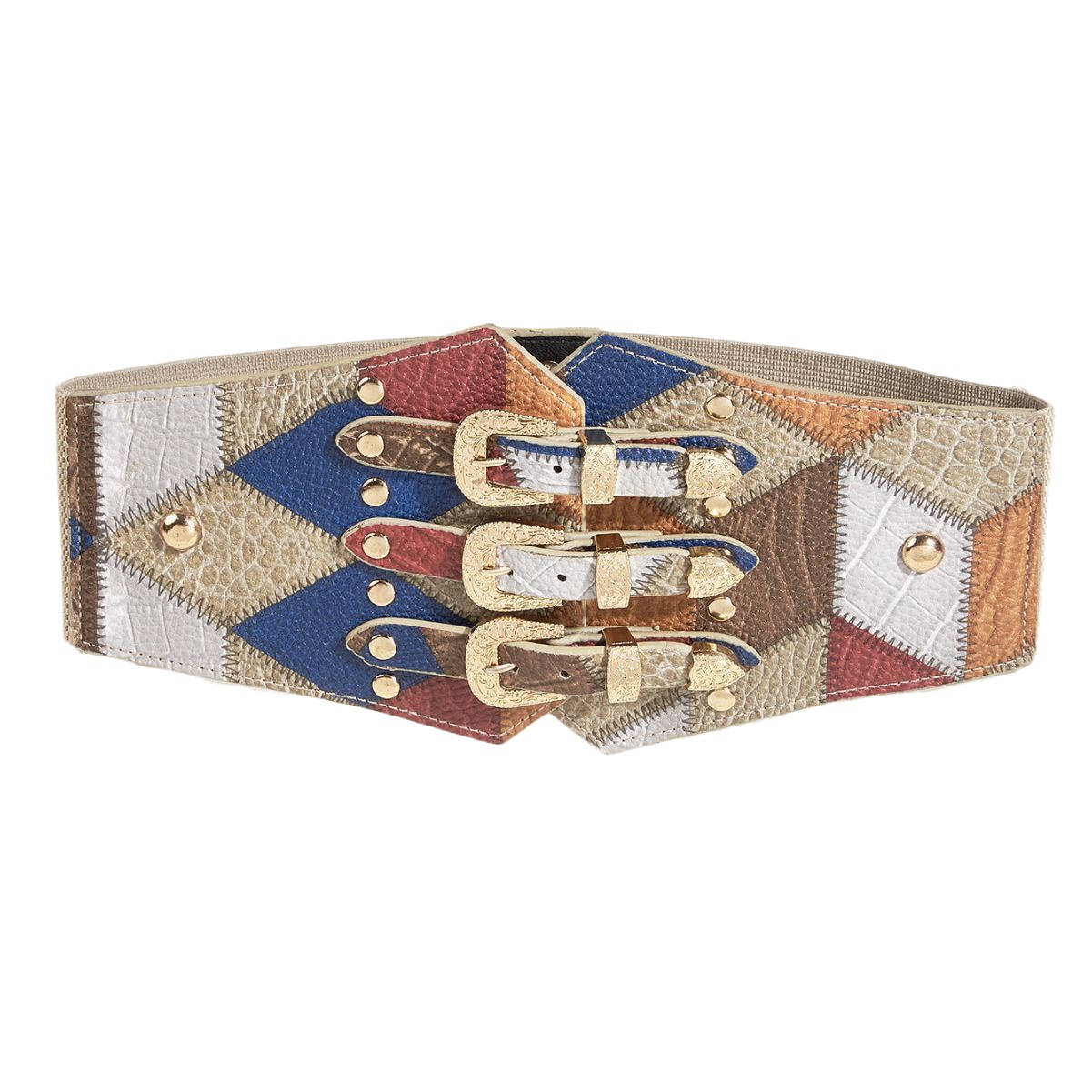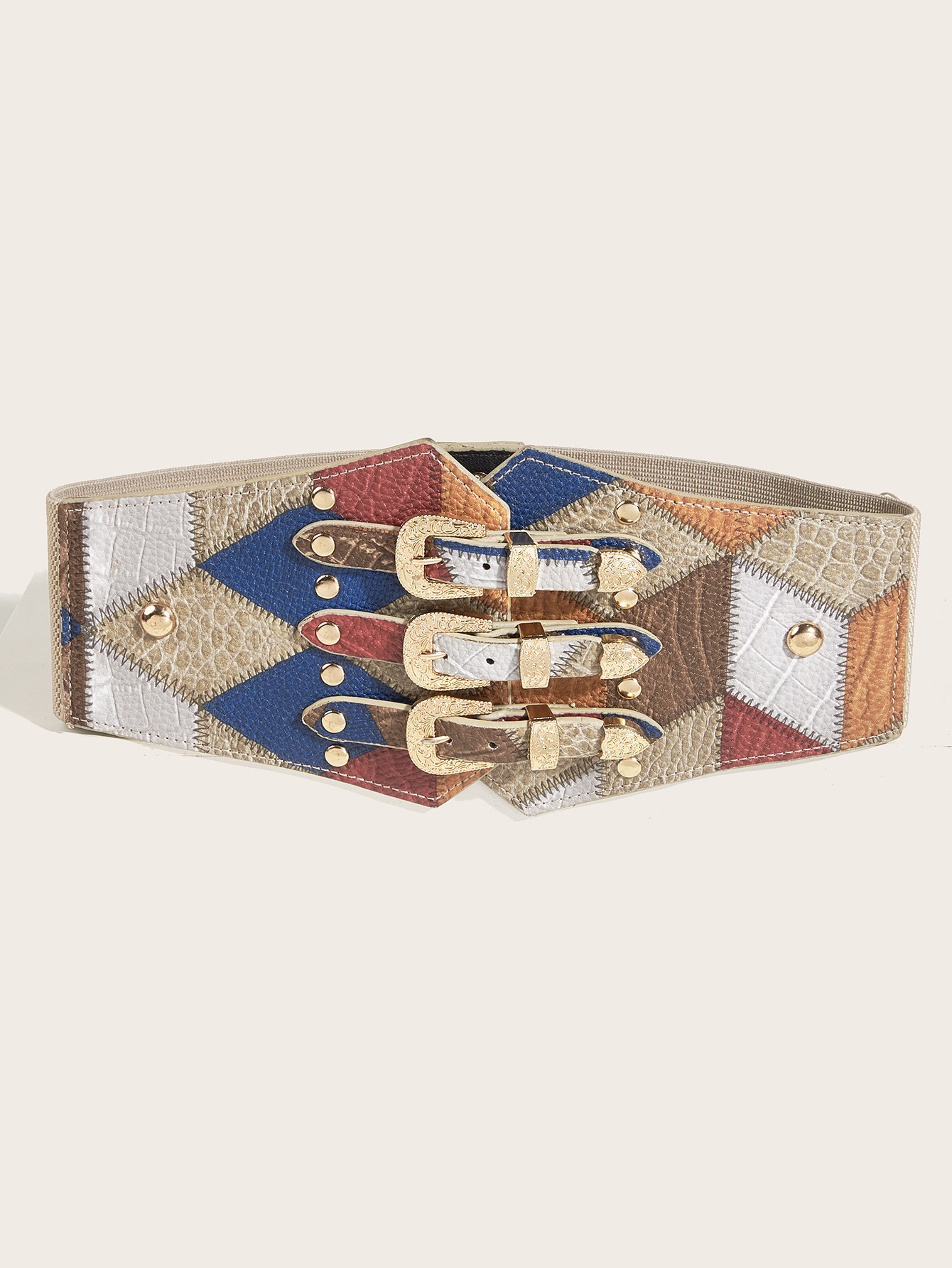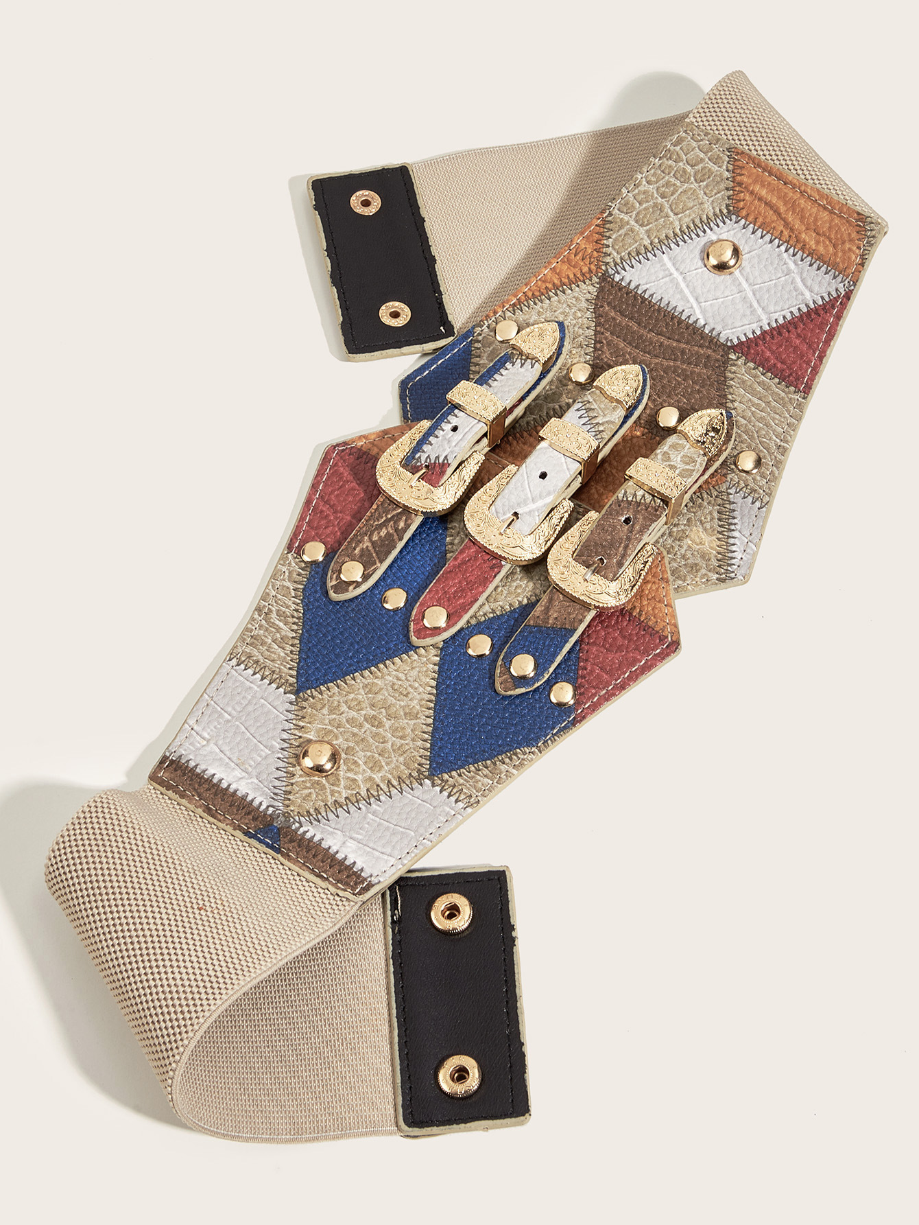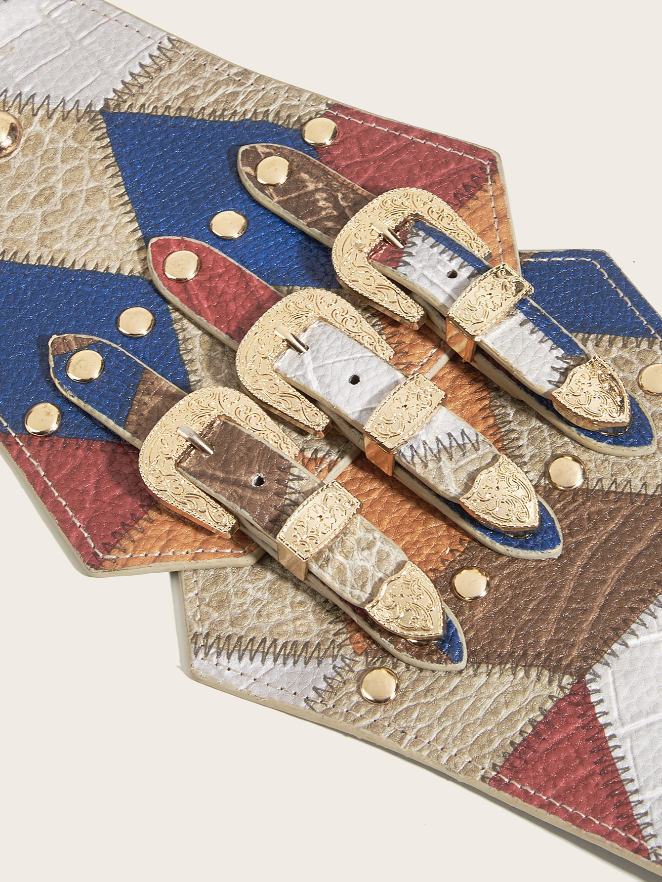 这款惊艳的复古拼接束腰带采用独特的三扣设计,瞬间提升您的时尚品味。色彩缤纷的拼接图案与几何图形交相辉映,打造出大胆的西部风情,是展现个性的完美之选。