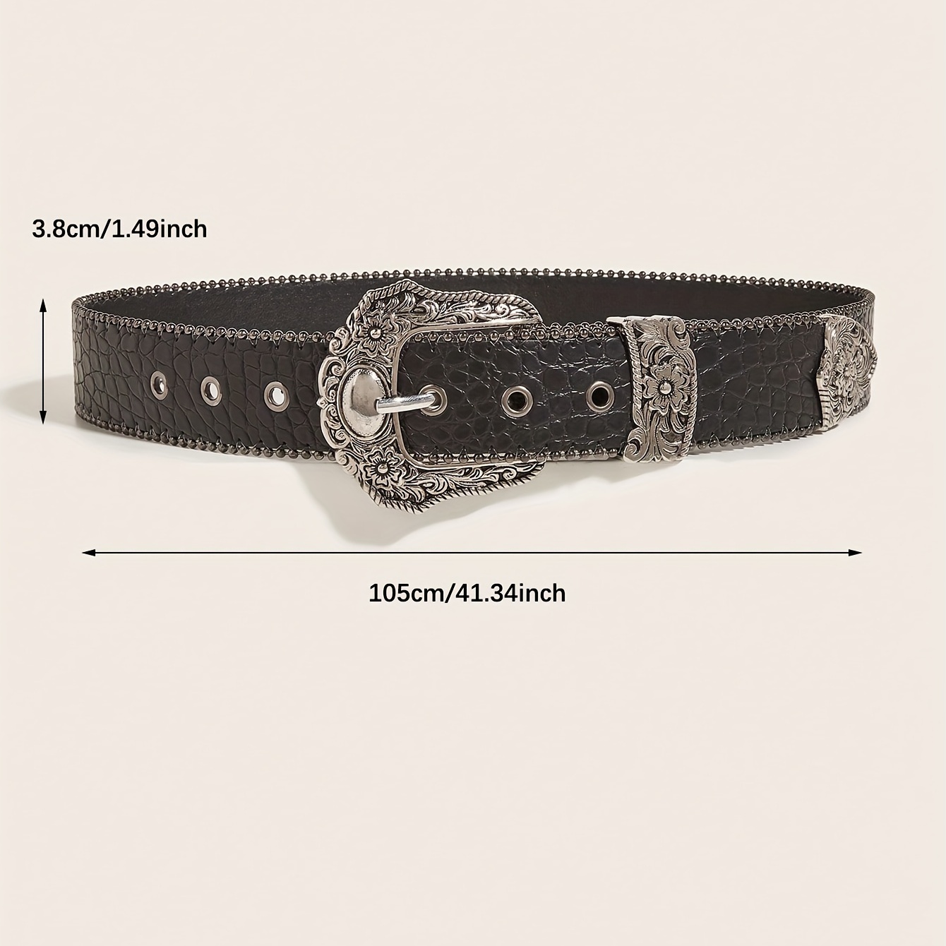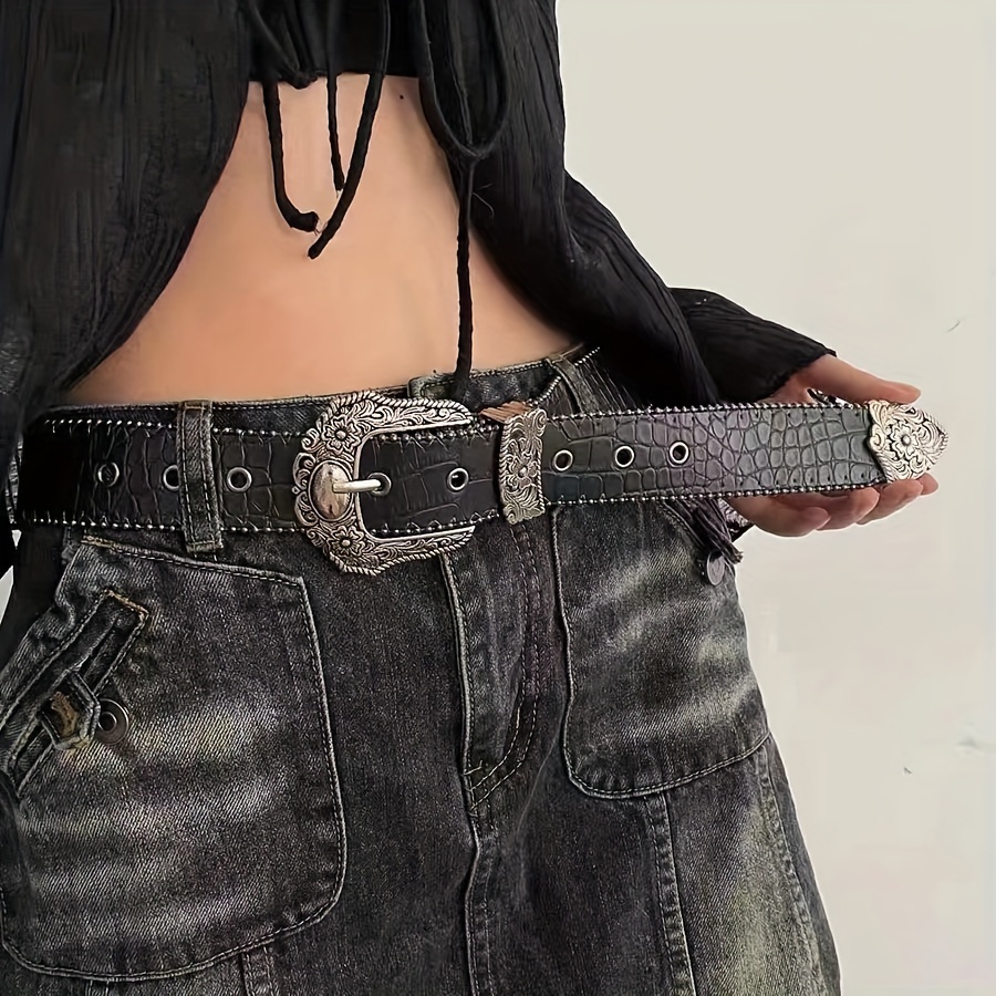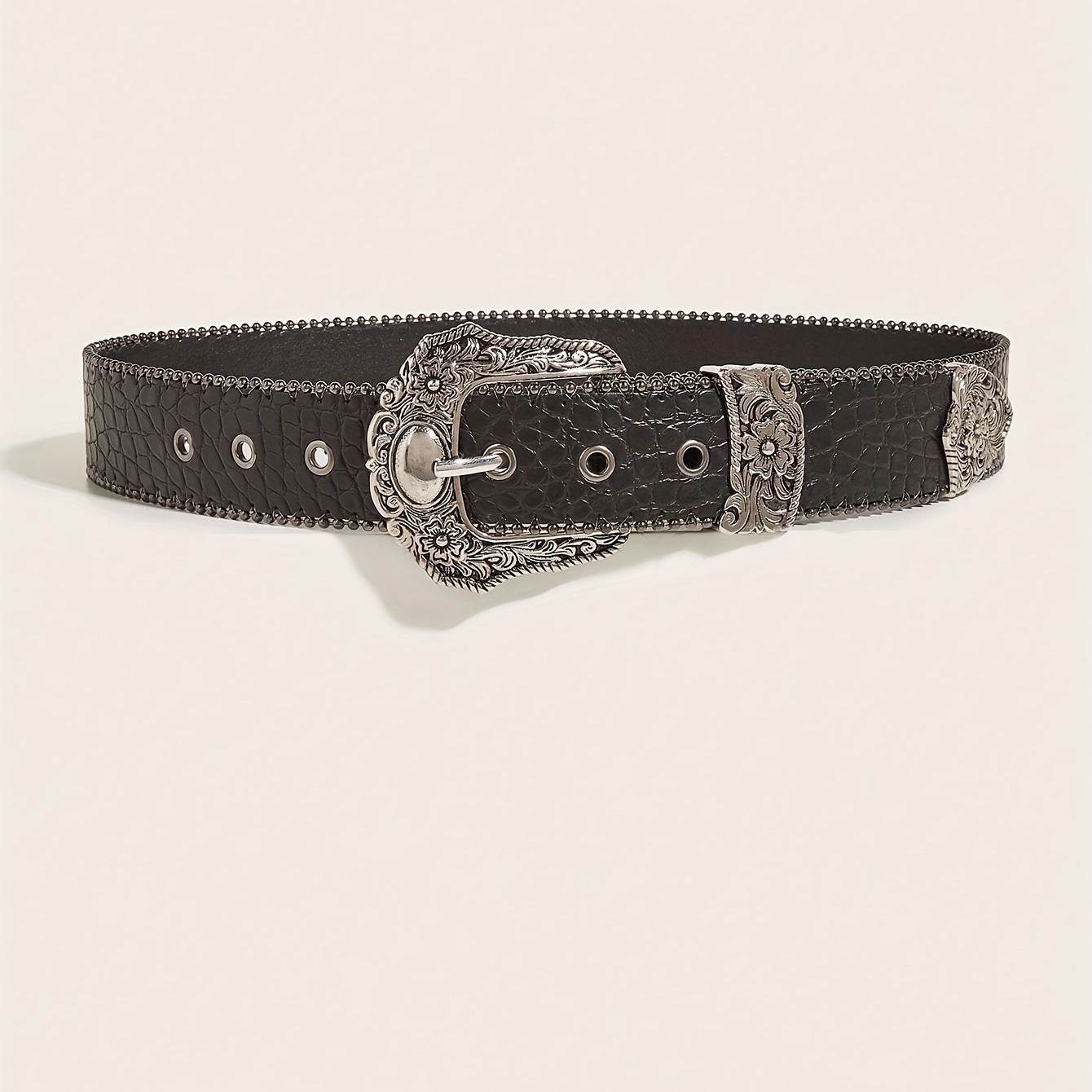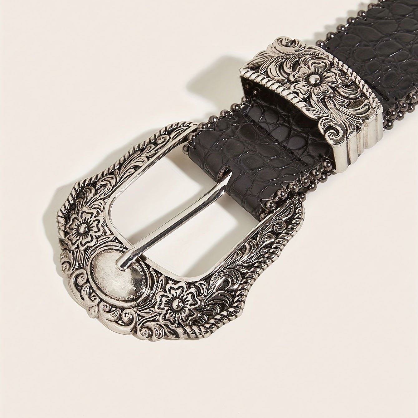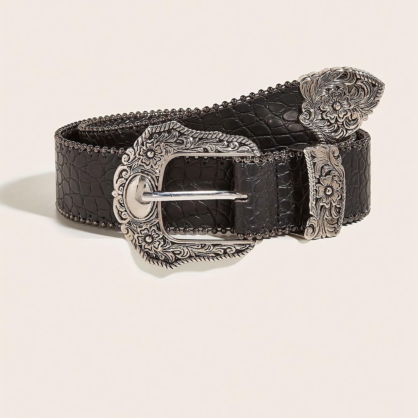 这款西部风格的腰带采用压纹鳄鱼纹饰带,搭配精美雕刻的仿古银质带扣、环扣和扣头。精致的花卉雕刻细节赋予腰带高级的手工质感,是希望在配饰市场脱颖而出的时尚品牌的理想之选。