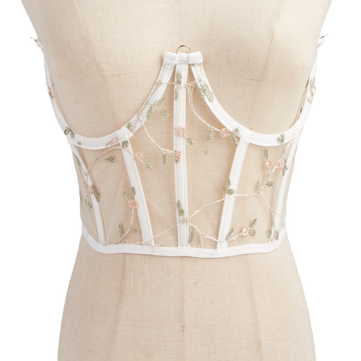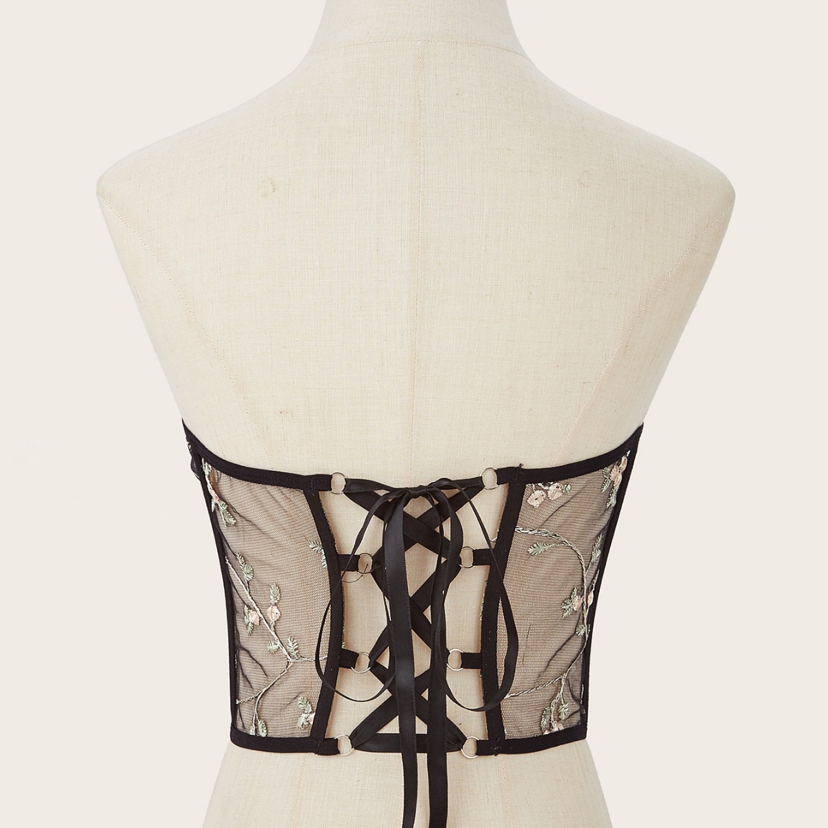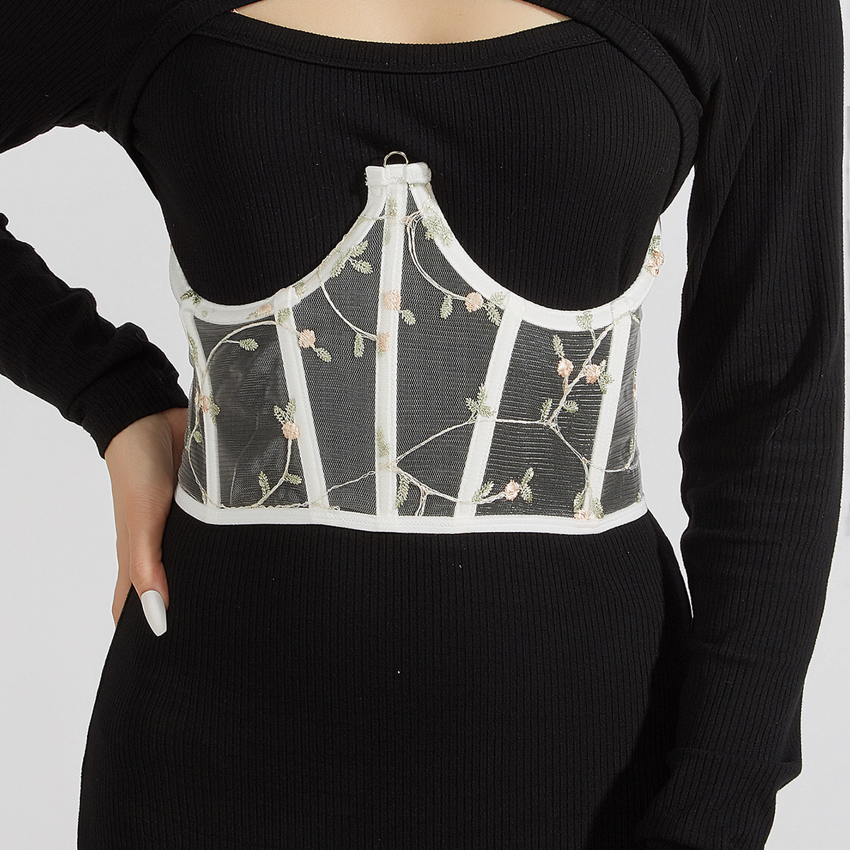 European style lace-up design with embroidered flower decoration, steel boned structure for waist cinching, perfect for outer wear.