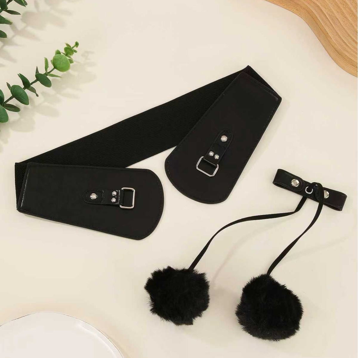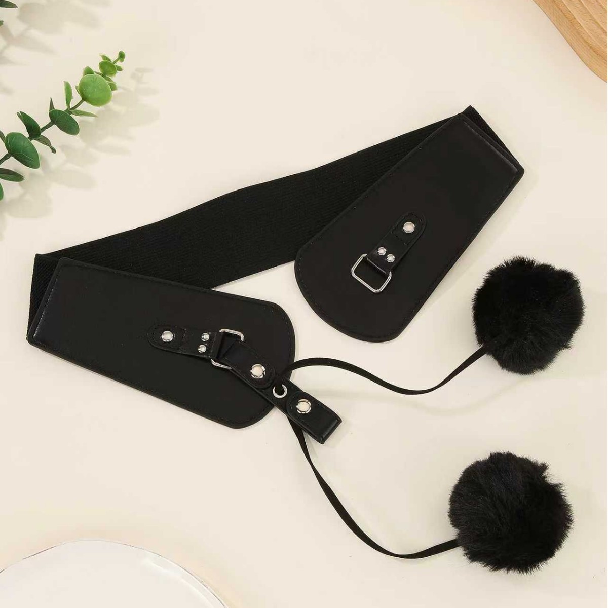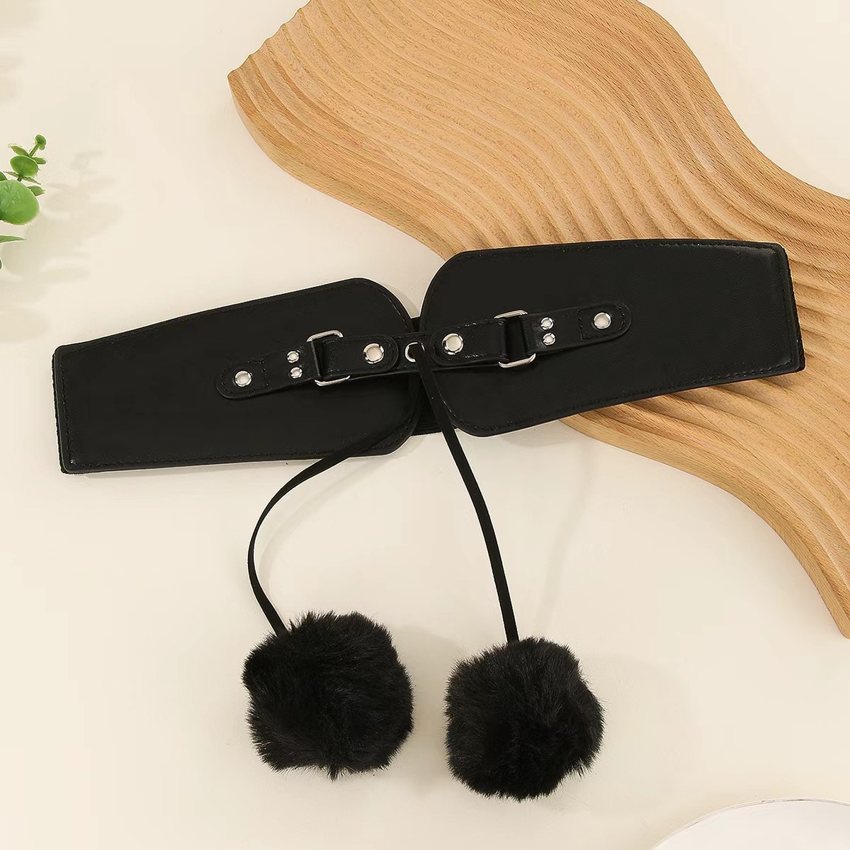 European and American vintage style women’s faux fur ball waist belt. Fashionable leather corset belt with metal buckle for outer wear decoration. Features a unique fur ball tie design with tassel elements.