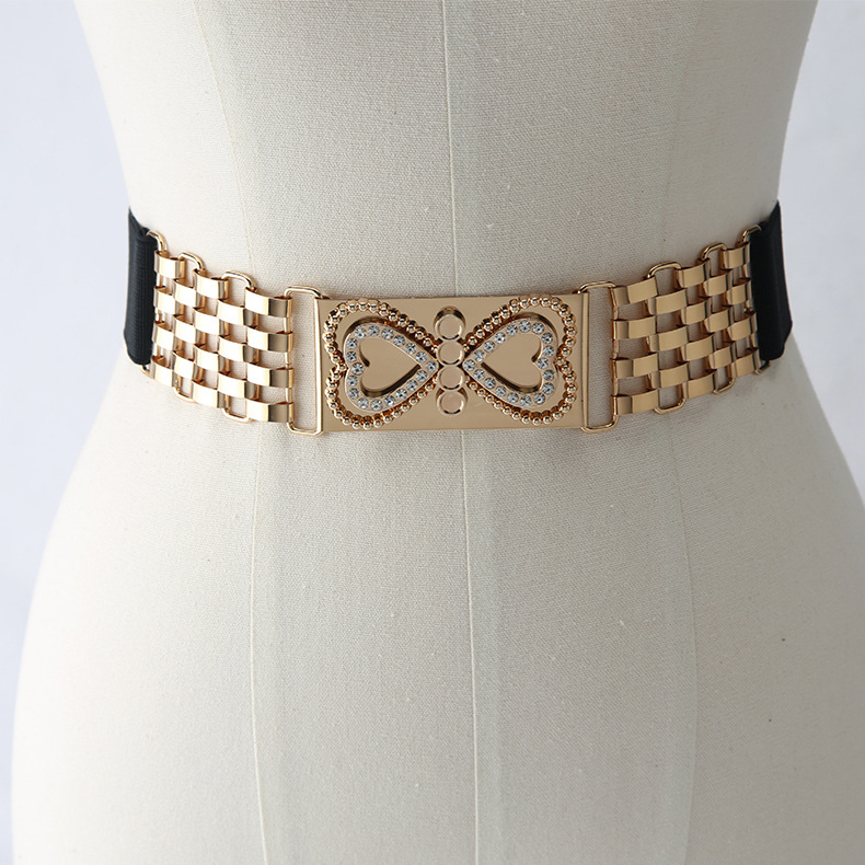 European and American style women’s heart buckle rhinestone elastic belt. Elegant metal waist belt with heart-shaped rhinestone decoration, perfect for pairing with dresses and skirts. Available in two styles: Heart Rhinestone and Lion design.