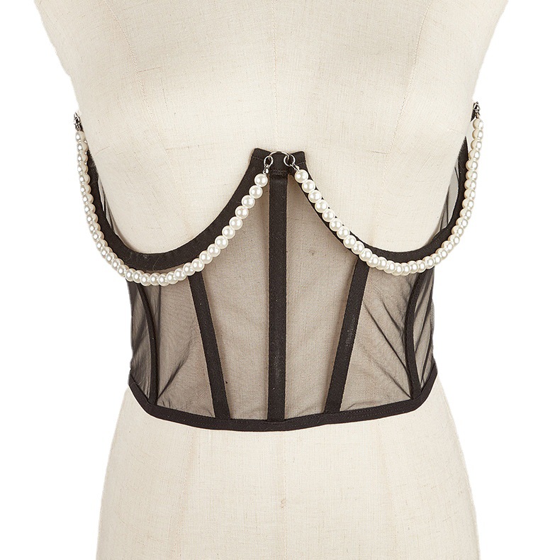 Handcrafted with pearl chain details. The steel boning provides structure while the mesh keeps it breathable and comfortable.