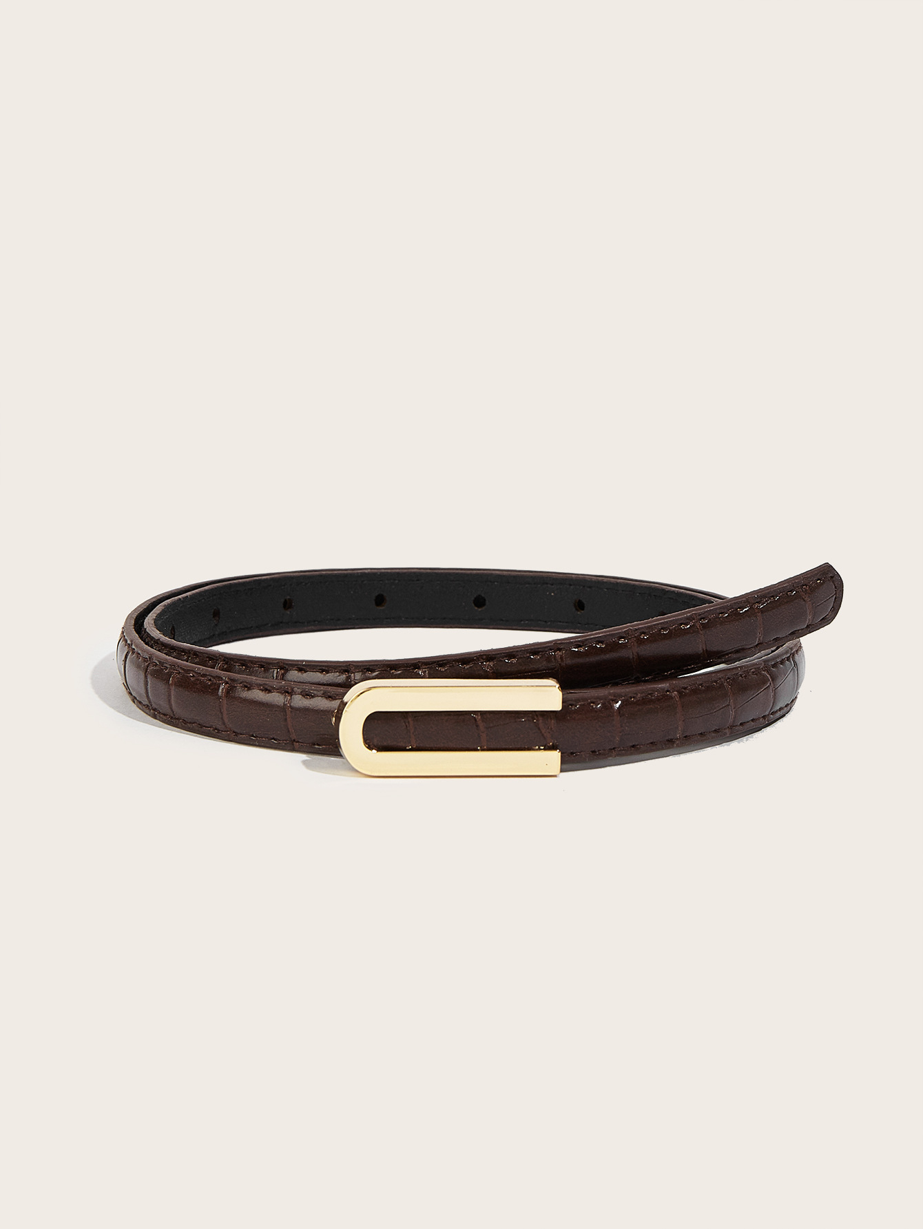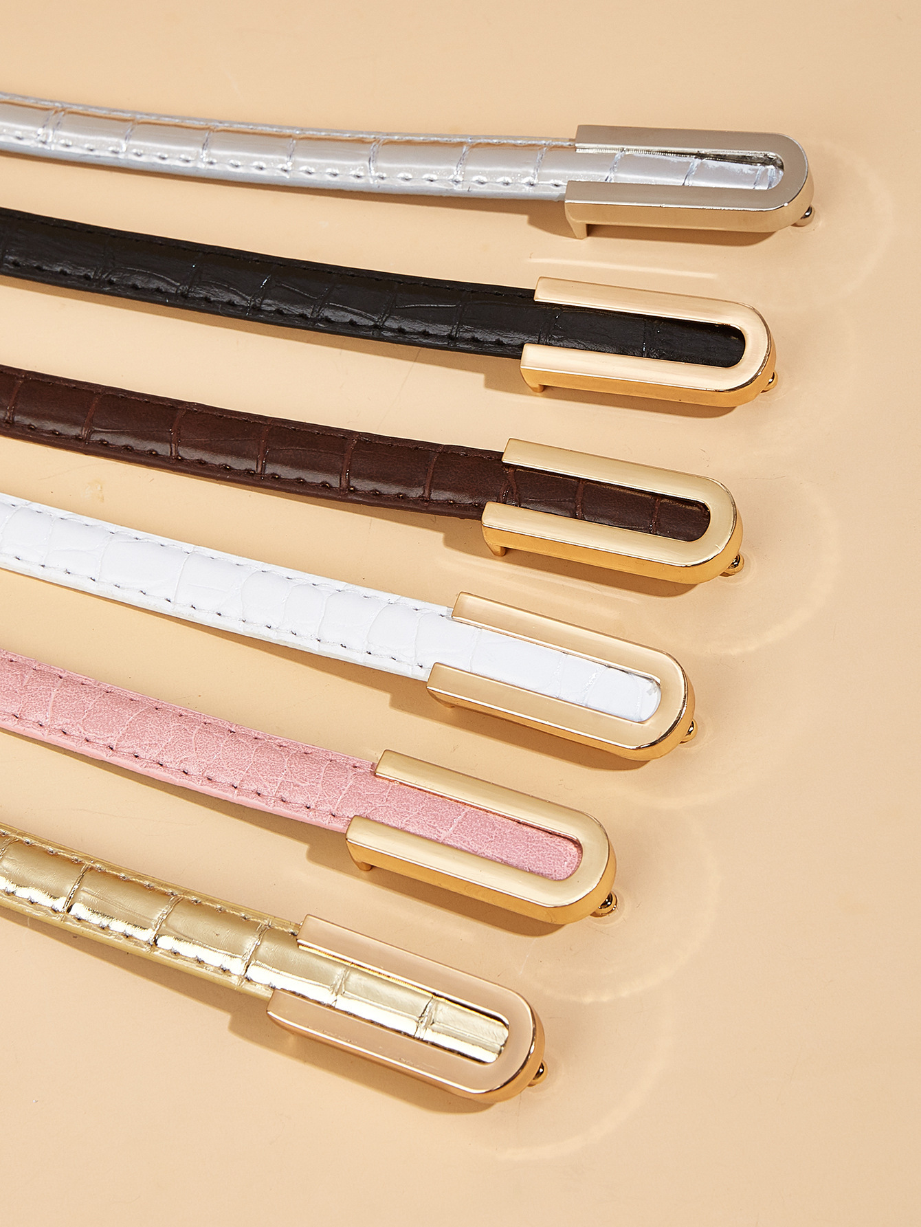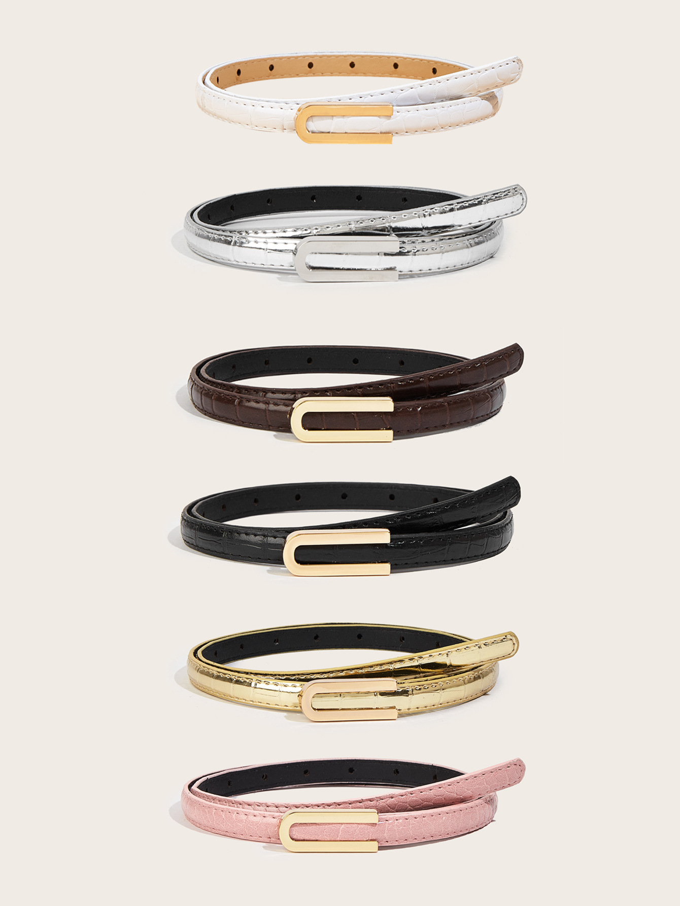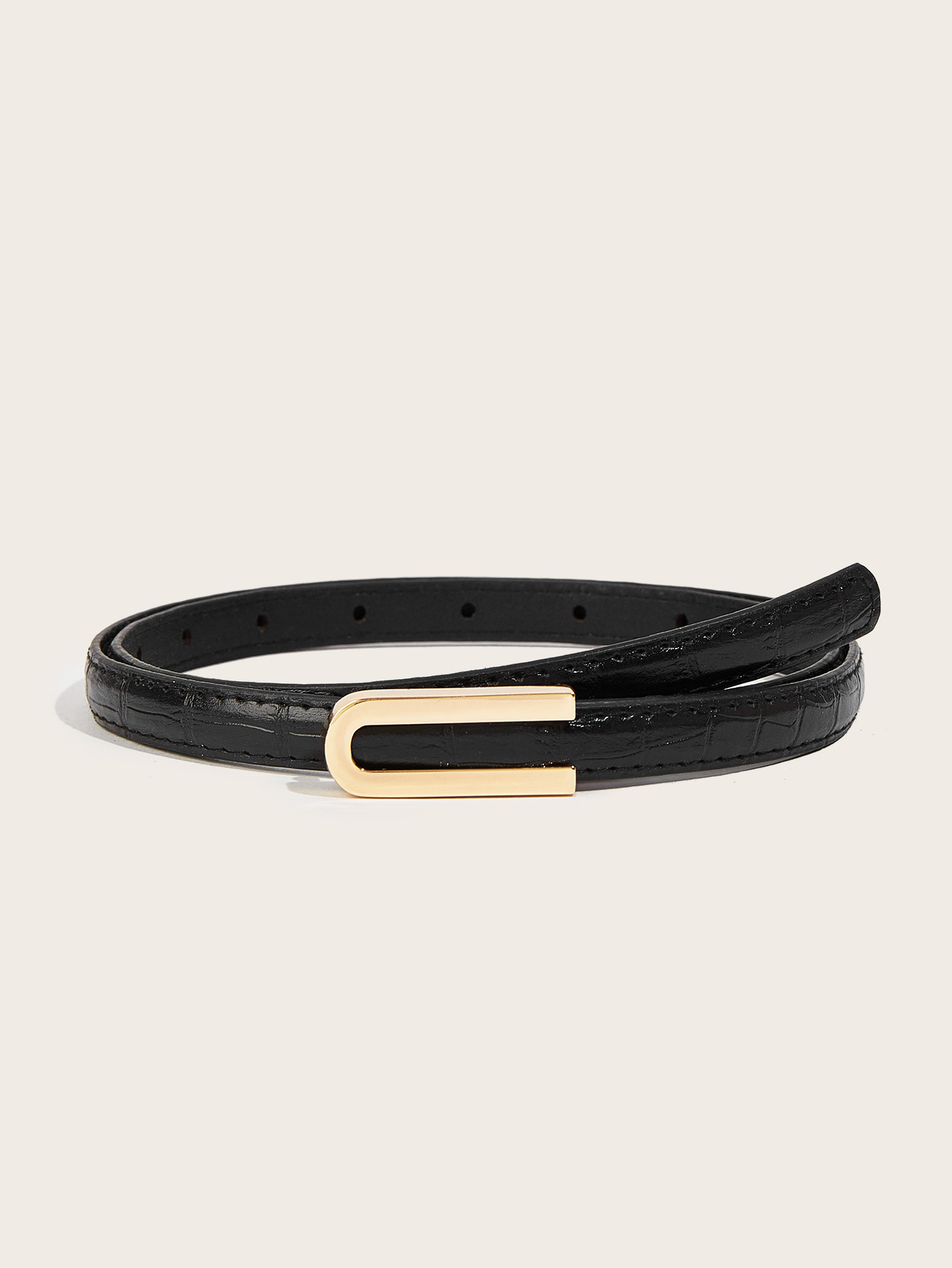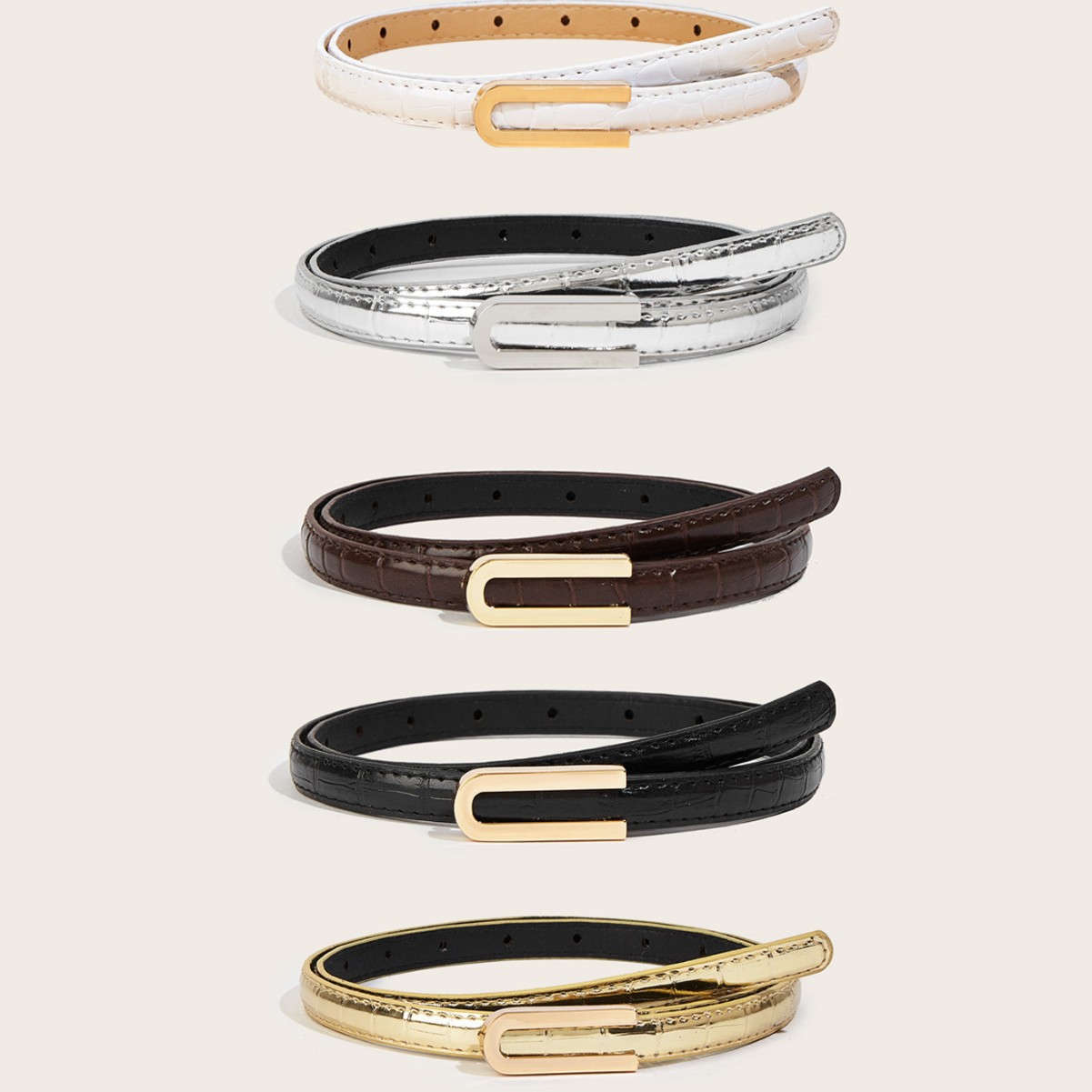 纤细的1.3厘米鳄鱼纹腰带,配U型扣。是搭配牛仔裤和连衣裙的完美配饰。共有6种颜色可选。