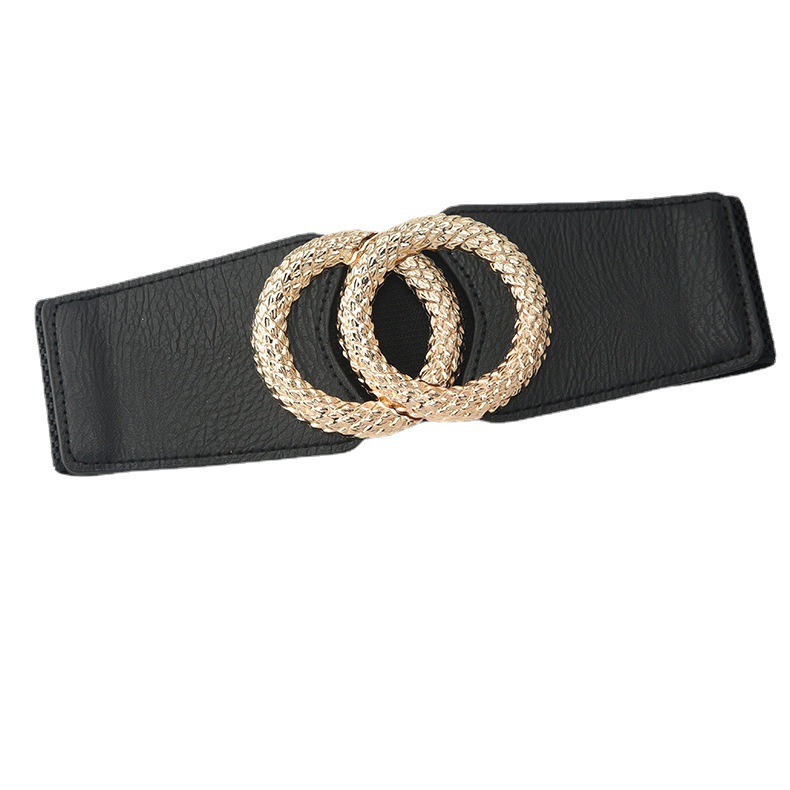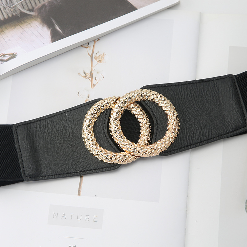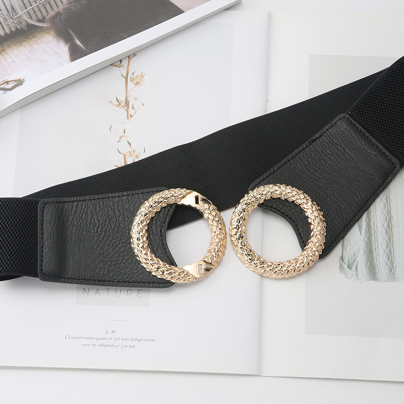 Trendy brand European and American style women’s snake pattern double round buckle elastic waist belt. Fashionable wide belt with unique snake skin pattern and double round buckle design, perfect for pairing with coats, dresses and suits.
