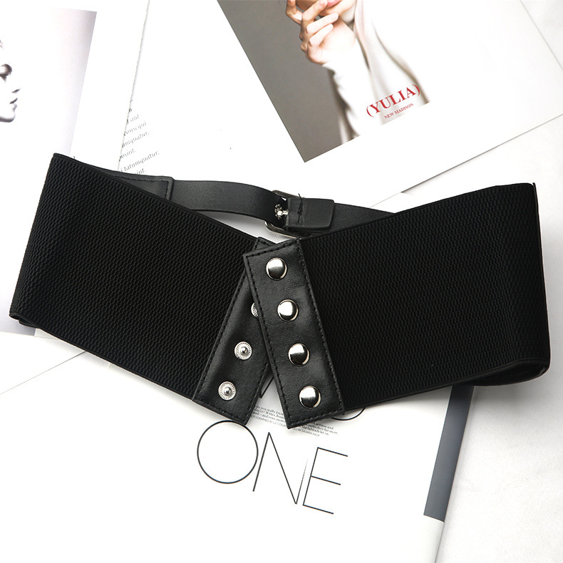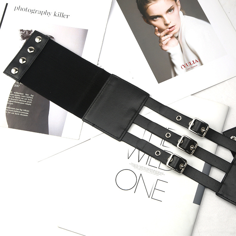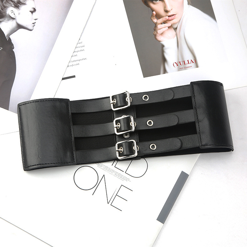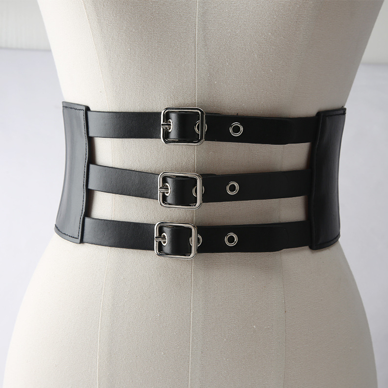 Retro trendy women’s triple pin buckle finger PU leather waist belt. Fashionable wide belt with unique finger-shaped design and three-row pin buckle, perfect for pairing with shirts and dresses.